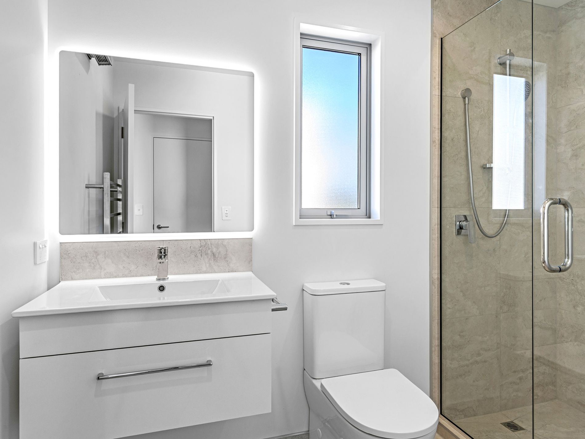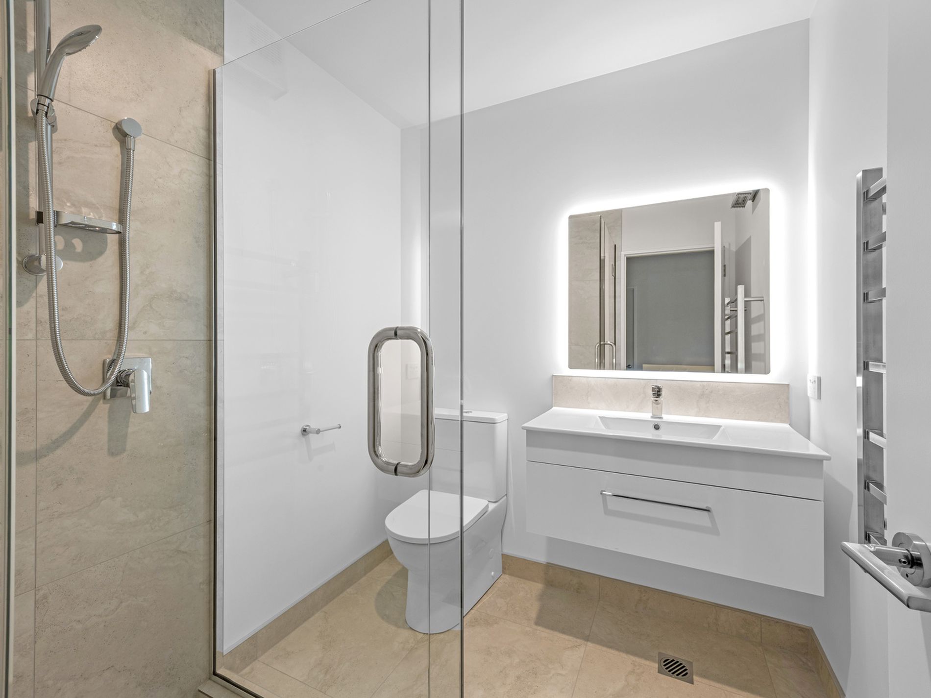 The home features two sleek, modern bathrooms with LED mirror surrounds, a well-designed living space, and a spacious private courtyard perfect for enjoying a morning coffee or evening wine and exterior power points at both the front and rear add extra convenience.